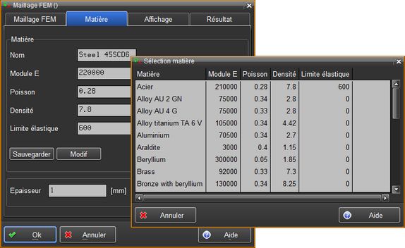 Un glossaire de matière est accessible en cliquant avec la touche MODIF de la souris sur les paramètres de la matière.