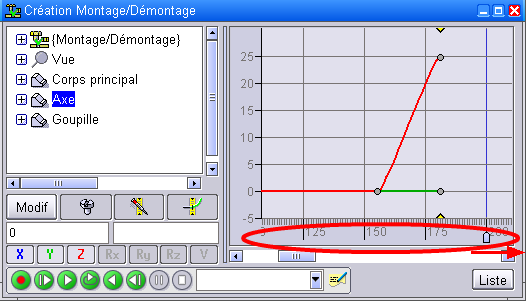 Échelle du temps L’affichage de la fonction « Échelle du temps » est disponible en cliquant avec la touche MODIF de la souris dans l’interface de « Montage-Démontage » sous la zone graphique. Cette fonction permet d’augmenter ou de réduire le nombre d’images totales mémorisées pour le défilement de la séquence.
