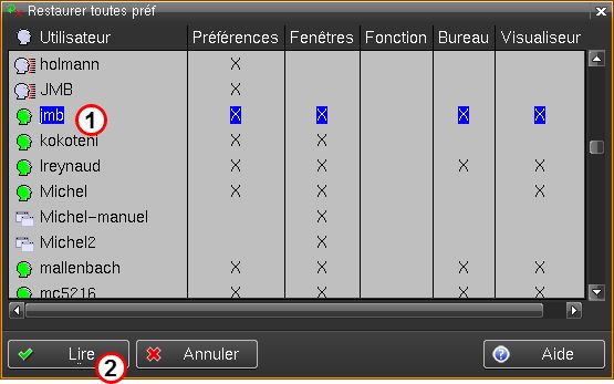 Restaurer tout Les cinq fichiers d'initialisation suivants sont sauvés ou restaurés d'un coup, voir Fichiers d'environnement . Toutes les grandeurs accessibles avec la fonction Modif préférences, ou avec la fonction Options affichages . Le fenêtrage Les choix et les positions des fenêtres des quatre Espaces de travail . Cette fenêtre n'est pas installée par défaut. L'utilisateur peut y regrouper un choix de fonctions qu'il utilise souvent. Le bureau Les fonctions modifiées ou ajoutées dans les bords du bureau. Le visualiseur Les fonctions modifiées ou ajoutées dans les fenêtres de dessin.