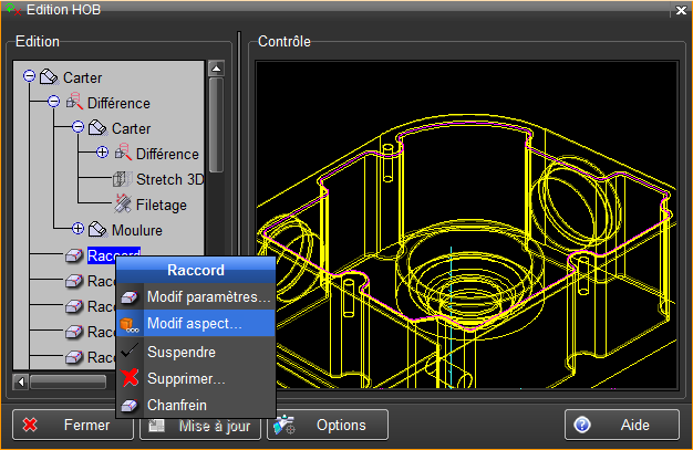 Affichage Les arêtes des raccords obtenus peuvent être mises en évidence avec une plume choisie, dans les fenêtres 3D et/ou les vues des mises en plan. La fonction « Raccord » est inclue dans l’historique de l’objet 3D , et s'applique de la même manière que pour la fonction « Chanfrein » . Les paramètres du raccord sont modifiables dans le HOB .