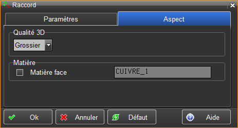 Sélection A l’appel de la fonction « Raccord », il faut sélectionner les arêtes à traiter. La méthode est identique à celle utilisée pour la fonction « Chanfrein ». Après validation de la sélection, une boîte de dialogue s'ouvre, qui permet de choisir les paramètres du raccord.
