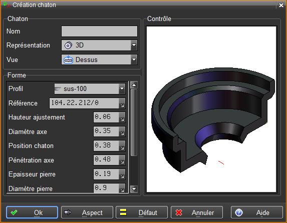 La création d'un chaton est principalement utilisée lors de la génération d'un composant amortisseur de chocs qui comprend le corps, le chaton, la lyre, la pierre et la contre-pierre.