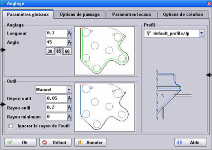 Grandeurs physiques de l'outil Le mode « Automatique » laisse au système le soin de fixer les grandeurs de l'outil. Le « Déport » est la distance entre l'axe de rotation de l'outil et les arêtes suivies, il influence la capacité de l'outil à aller plus ou moins profondément dans les passages concaves de sa trajectoire. L'indication du « Rayon de l’outil » permet au système d'effectuer des test simples de collision. L'indication du « Rayon minimum » dépend des capacités d'usinage au plus près de la pointe de l'outil. Grandeurs de l'outil standard (chanfrein) La vue en coupe d’un outil d’anglage permet de visualiser les différentes variables sur lesquelles il est possible d’agir.