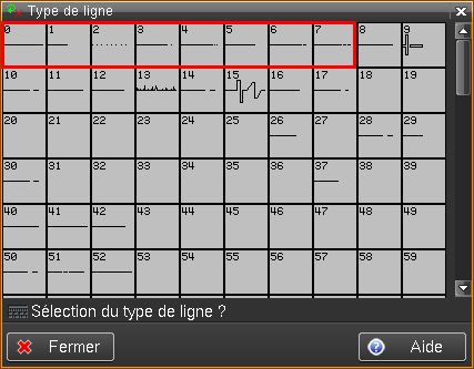 Un type de ligne est affectée à chaque entité du dessin. La table des types de lignes est définie et active pour l’ensemble du dessin en cours. Les types de lignes utilisés par le dessin en cours sont enregistré avec celui-ci. Il y a 8 types de lignes système non modifiables (de 0 à 7) et 246 type de lignes utilisateurs (de 8 à 253) modifiables.