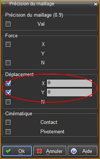 3. Les paramètres FEM sont accessibles et permettent de bloquer l’ensemble des nœuds se trouvant sous les entités sélectionnées. Le blocage s’effectue en définissant un déplacement des nœuds du maillage à 0 en X et en Y.