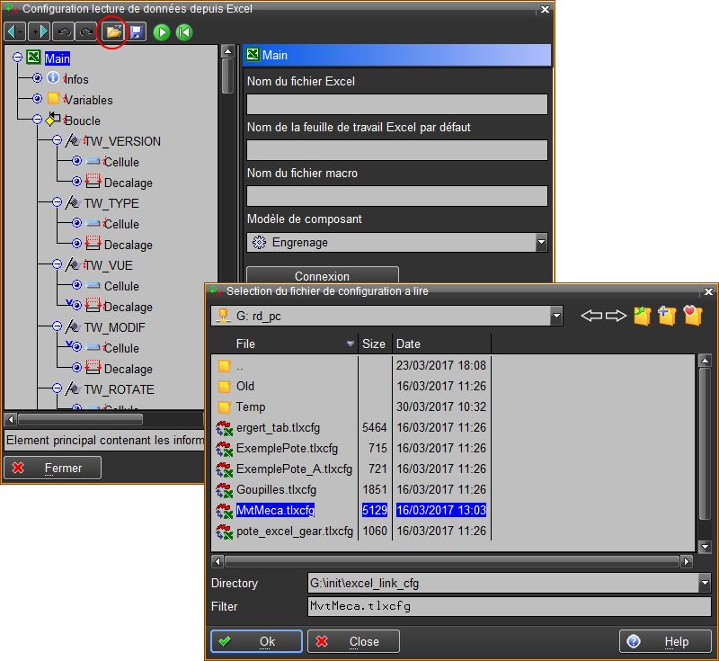 3-Lancement de la fonction Exec config Excel (2131) Choix du fichier de configuration fait précédemment : MvtMeca.tlxcfg