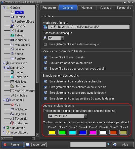 Cette fonction peut être activée dans Options. Il est également possible d'initialiser les 8 couleurs de plumes de base pour les anciens dessin n'ayant pas les préférences associées.
