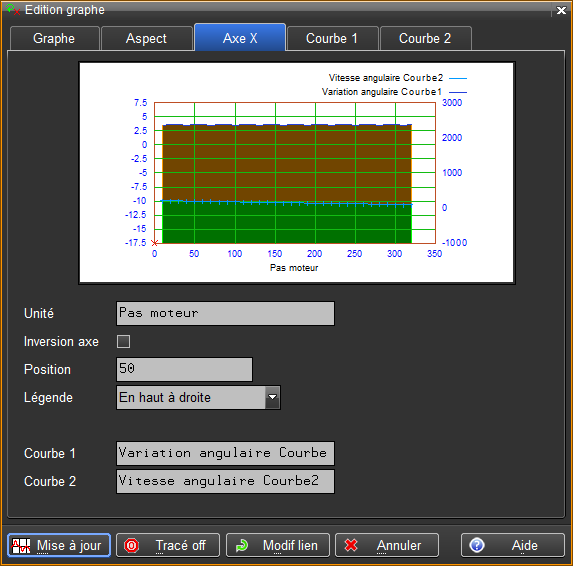 Position X,Y du graphe. Paramètre d'échelle, d'angle. Vue: Affiche ou éteint le contenu du graphe Remplissage : affecte ou non une plume au fond du graphe Ok: Valider les modifications Edition graphe: Lancer l 'édition du graphe Nomenclature: Éditer les paramètres de nomenclature
