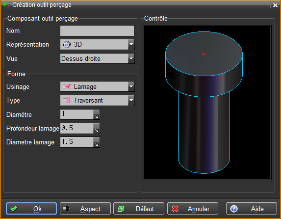 Permet de créer un outils de perçage. Cette fonctionnalité est principalement utilisée lors de la création d'un Composant de révolution.