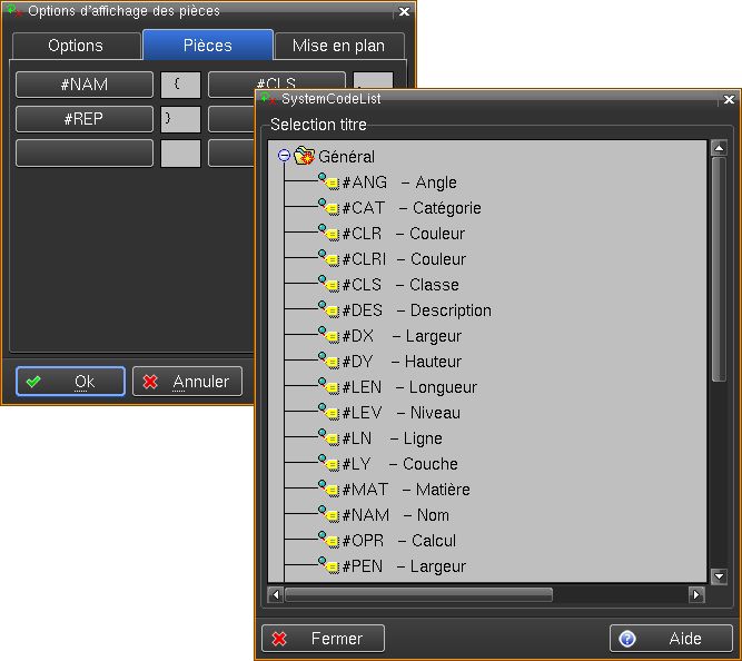 L'index 'Pièces' permet de sélectionner les caractéristiques que l'on désire afficher pour chaque pièces. Il est possible de sélectionner dans la liste générale des attributs des pièces, ainsi que dans la nomenclature.