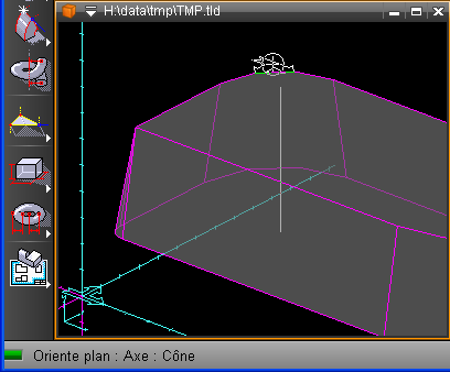 Autre exemple : curseur sur l'intersection de deux faces courbes, formant un arc de cercle. L'orientation du plan porteur de cet arc est utilisé.