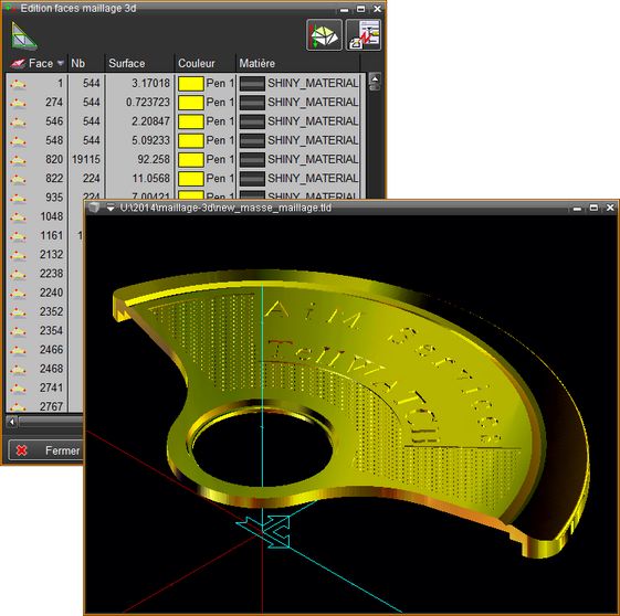 La fonction de recherche de surface dans le dessin, disponible dans la fenêtre d'édition des facettes d'un maillage 3d, permet la recherche d'une surface dans le dessin. La surface trouvée est placée dans la sélection et visible dans la fenêtre d'affichage des surfaces.