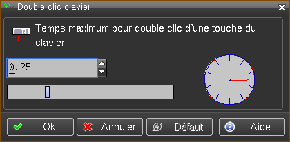 Permet de régler le temps du double clic du clavier. La valeur par défaut est de 0.25 secondes. Cette fonction peut être modifiée dans les Options de l'utilisateur.