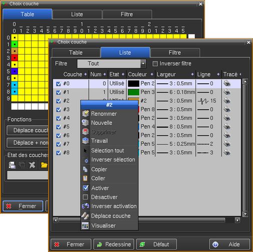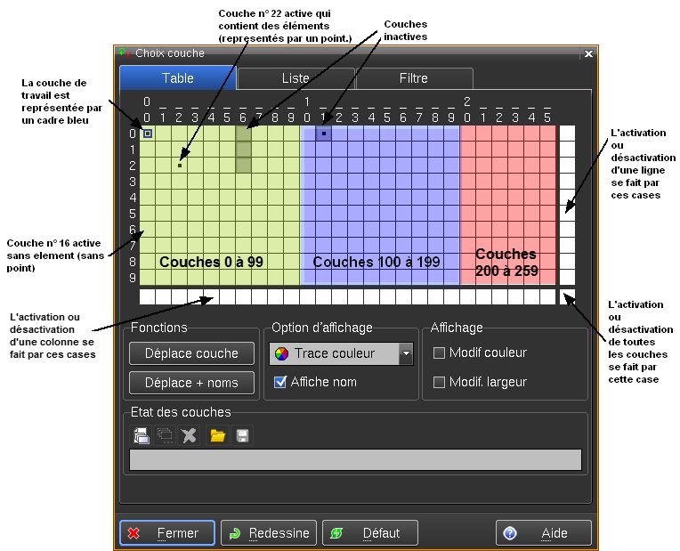 Pour gérer l'état des couches il faut utiliser la fonction Choix couche(20), ou cliquer sur l'icone suivant dans la zone 8 du Desktop.