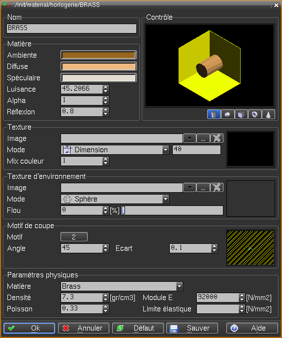 Les modifications sont locale à la matière associée au dessin. Si l'on désire modifier la matière de la librairie, il est nécessaire de l'enregistrer avec la fonction 'Sauver' depuis la boite de dialogue de modification de la matière.