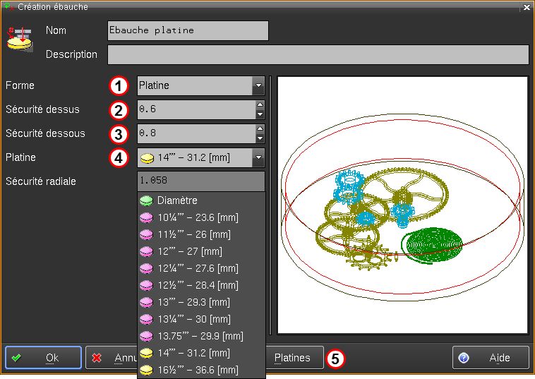 Une fois les composants du mécanisme positionnés, la  fonction « Ebauche »  propose une liste de dimensions pour l’ébauche en fonction de l’encombrement de l’ensemble des composants du mécanisme. L’ébauche est composée d’un contour de tournage et d’un contour d’élévation que l’on peut modifier dans l’historique de construction (HOB).