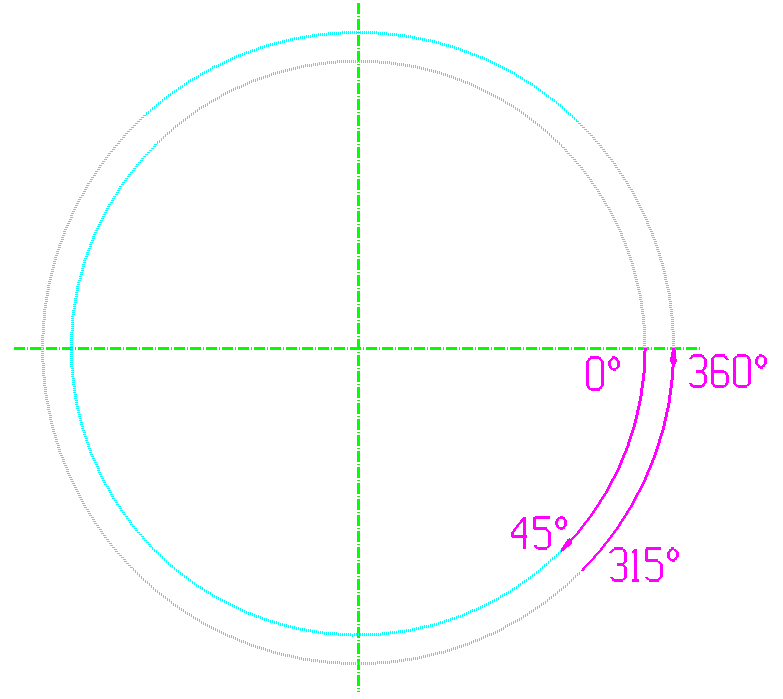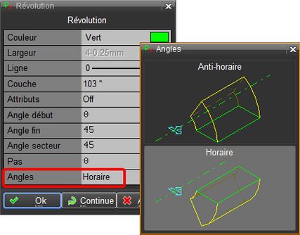 La saisie des angles de début et de fin pour les fonctions Révolution , Révolution face , Hélicoïdal et Hélicoïdal face peut être faite dans le sens « horaire » (enroulement autour de l'axe Y dans le sens des aiguilles d'une montre) ou « anti-horaire » (enroulement dans le sens inverse, « trigonométrique »). (version 2017) Un bouton dans les masques de saisie permet de passer de l'un à l'autre mode. Ce choix influence uniquement la convention de saisie des angles, l'objet résultant est identique. Le même choix est proposé lors de la modification des paramètres de ces fonctions dans l'historique de construction (HOB). Fonctions avec par défaut le sens « horaire » Les fonctions Révolution et Hélicoïdal sont basées sur une révolution partant dans le sens « horaire ».