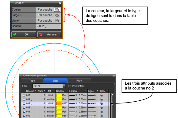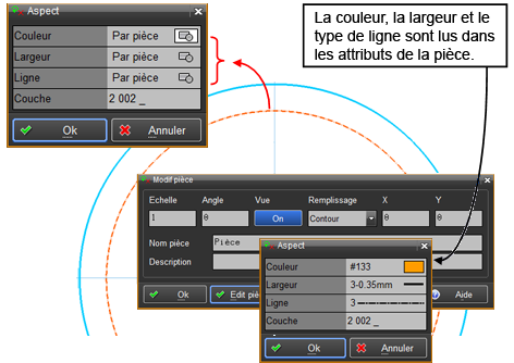Dans les préférences de l’utilisateur une option peut être activée afin d’accéder aux possibilités d’affecter, la couleur, la largeur et le type de ligne associés à une couche ou à une pièce, à une entité.