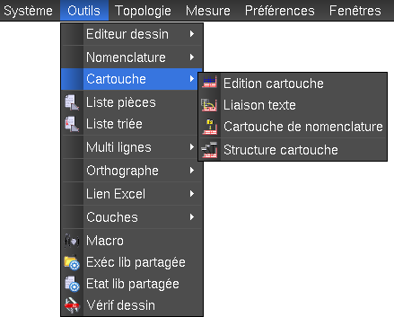 •Informer le cartouche avec Cartouche de nomenclature (1402) ou Edition cartouche (1398).