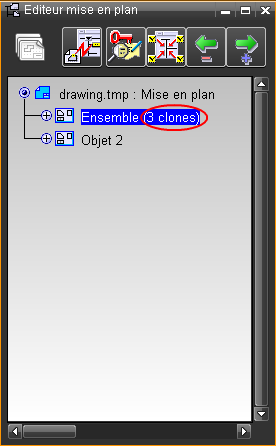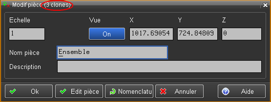 Le nombre de clones appartenant à une même famille est indiqué dans la Fenêtre pièces quand un clone est sélectionné, ou quand la Mise en plan liée à un clone est sélectionnée. Il est aussi indiqué en titre lors de la Modification d'une pièce ou de l'édition du HOB d'un objet.