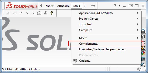 Passer ensuite à l'étape 3 pour activer le programme additionnel. 3.Activation du programme additionnel dans SolidWorks Démarrer ou redémarrer SolidWorks. Aller dans "Compléments...".