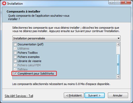 L'utilisation du programme additionnel pour SolidWorks permet d'optimiser les performances du transfert SolidWorks <-> Tell. Il est disponible seulement pour SolidWorks et Tell 64 bits. Il est installable, soit automatiquement par le programme d'installation de Tell, soit manuellement (dans le cas d'une installation réseau de Tell). 1.Installation automatique Le programme d'installation de Tell doit être exécuté sur une machine où SolidWorks est installé. Il suffit de cocher "Complément pour SolidWorks" dans la page "Composants à installer" du programme d'installation de Tell.