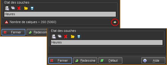 Dans certains cas le nombre de couches augmente, particulièrement lors de la lecture ou de l'insertion de dessin DXF ou DWG. Si le nombre de couches est supérieur à 260, qui est le nombre de couches par défaut, un avertissement est affiché au bas de la fenêtre des couches et une icône à droite du message permet la compression des couches non utilisées après 260.