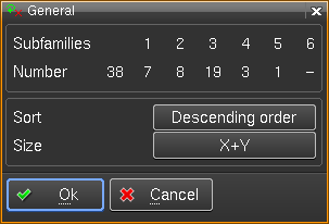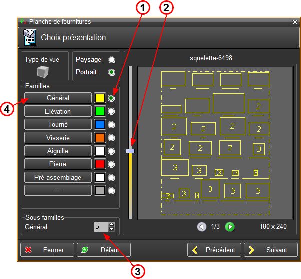 Dans la fenêtre de contrôle de la présentation, chaque famille de pièces est représentée par une couleur différente. En sélectionnant l’une des familles (1), il est possible de changer l’échelle de représentation dynamiquement à l’aide du curseur (2). Pour chacune des familles, un nombre de sous-famille peut être défini afin d’affiner les échelles de représentation de chaque entité appartenant à une famille. Le système propose un nombre optimisé automatiquement. Il peut être modifié (3). Les entités d'une même sous familles sont toutes à la même échelle. En cliquant avec la touche MODIF de la souris sur une des familles (4), la répartition du nombre de pièces par sous-famille est indiqué et des options sur le tri des pièces par famille sont disponibles.