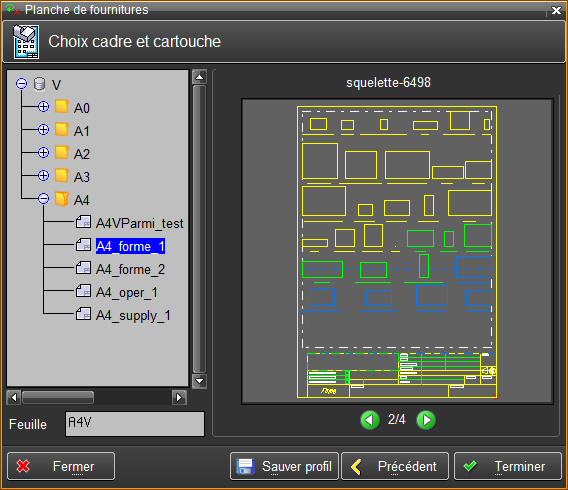 Etape 4 : Choix cadre et cartouche Cette étape permet de sélectionner le format du cartouche. Il est possible de revenir à l’étape précédente pour affiner les échelles de chacune des familles afin d’améliorer la mise en page dans chacun des cartouches.