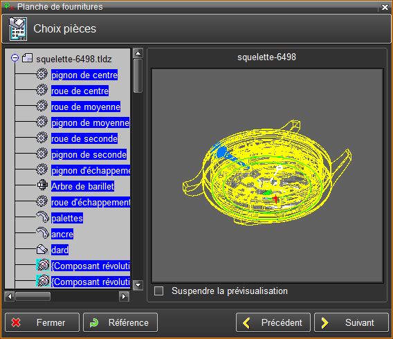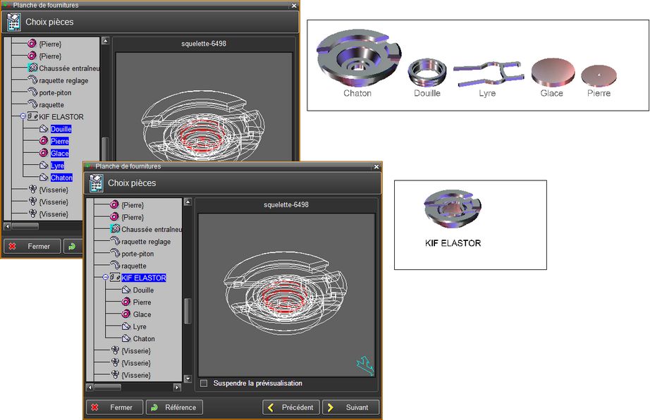 Famille et sous-famille Les différents types de pièces sont regroupés par familles: Élévation : Composant d'élévation (élévation a partir d'un contour 2D) Tourné : Composants de révolution(pivot, barette, came, engrenage, composant de révolution) Ressort : Composant 3D ayant un lien avec un contour Maillage FEM 2D. Visserie : Composant de visserie (vis, goupille, bouchon, entretoise, tenon) Aiguille : Composant aiguille. Pierre : Composant de type pierre. Brillant : Composant de type Diamant. Pré-assemblage : Tous les sous-assemblages composés de différents symboles. Général : Tous les autres composants non cités ci dessus.