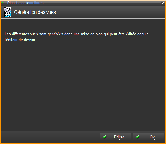 Etape 5 : Génération des vues Cette dernière étape permet de générer la représentation des vues de chacune des pièces et des cartouches de la planche de fournitures. En cliquant sur le bouton « Edit », la planche de fournitures est éditée dans l’environnement défini au préalable dans les options de l’onglet « Interface ».