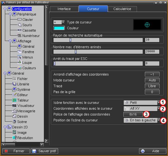 3.Police de caractères utilisée pour l'affichage de la question courante et/ou des coordonnées. 4.Position de l'icône de la fonction associée au curseur.