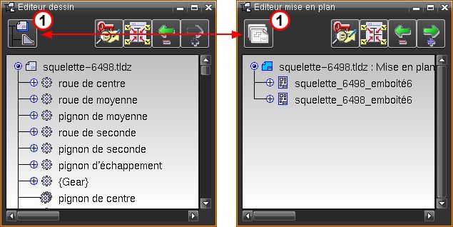 En cliquant sur le point (1), il est possible de basculer entre la liste des pièces, la liste des planches de fournitures et les mises en plan existantes.