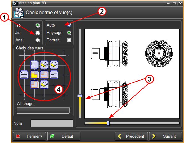 2- Choix de l'orientation Paysage ou portrait. Si le choix est « Auto », le système détermine l'orientation en fonction de l'encombrement des zones vues. 3- Gestion de l'espace entre les vues avec les curseurs Plutôt rapproché pour des vues d'ensemble, au contraire espacé pour des vues de détail afin d'insérer la cotation et les informations nécessaires. 4- Choix des vues à insérer