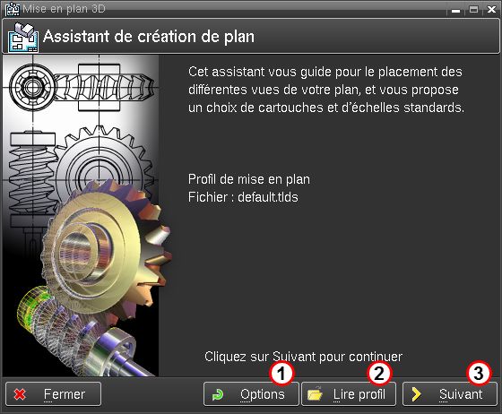 L'assistant de création de mise en plan suit les étapes suivantes: •Etape 1: Accueil, possibilité de modifier les options et de lire un profil •Etape 4 : Choix cadre et cartouche •Etape 5 : Génération des vues