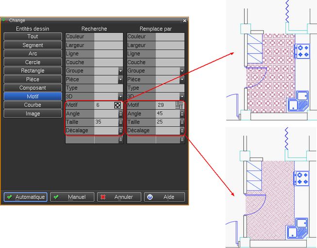 Il est maintenant possible, depuis la version 2012, de remplacer les motifs d’un dessin, il est également possible de faire une sélection ou une suppression sélective des motifs.