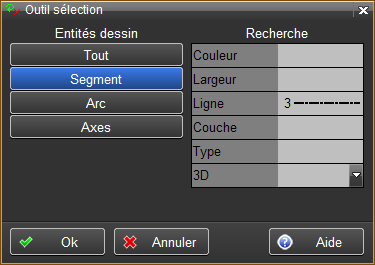 Permet de sélectionner dans une boîte de dialogue , selon des critères choisis (type d'entité, plume, couche...), les éléments à inclure dans la sélection. Les paramètres de la recherche dépendent des types d'entités sélectionnés.