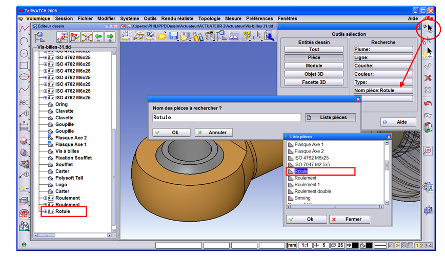 Au travers de la fonction « outil sélection » il est possible de sélectionner des pièces par leur nom: