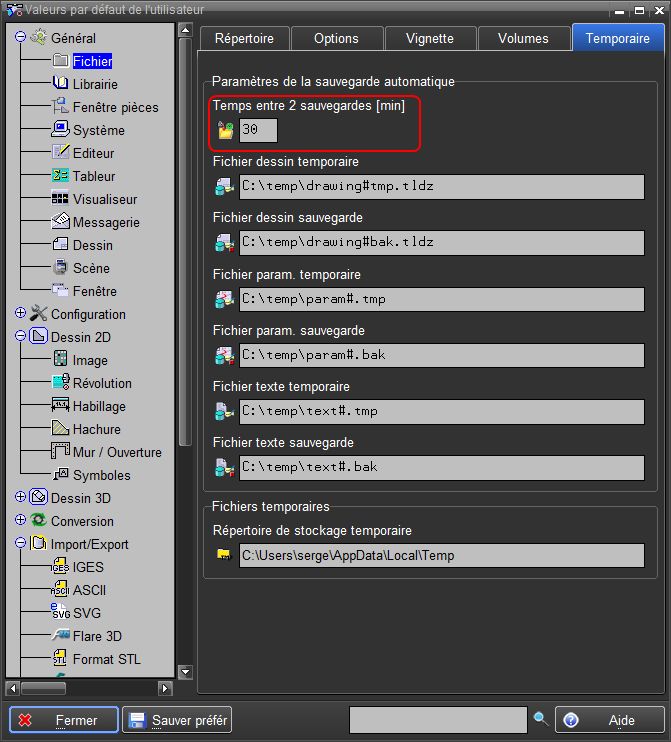 Indépendamment de l'intervalle choisi, la sauvegarde automatique s'effectue également dans les cas suivants: exécution de Lire tout , exécution de Suppression , passage du mode Dessin au mode Paramétré et inversement, et à la sortie du logiciel.