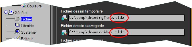 Permet de modifier le nom du fichier de sauvegarde automatique du dessin. A chaque nouvelle sauvegarde automatique, ce fichier est copié dans le fichier de sécurité du dessin . Les performances lors de l'enregistrement du fichier temporaire ou du fichier de sécurité sont améliorées si l'on ajoute l'extension .tldz qui force l'enregistrement de ces fichiers sous une forme compressée qui produit des fichier plus petit et plus rapidement.