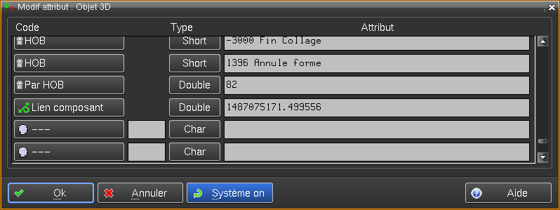 La modification d'attributs est possible en utilisant deux fois la fonction Modif sur un élément. Cliquer ensuite sur Attribut pour accéder à la boîte de dialogue. Les attributs gérés par le système ne sont pas modifiables par cette fonction mais pas les fonctions dédiées qui les utilisent.
