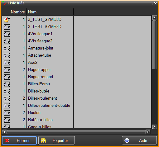 Permet d'afficher la liste triée par nom des pièces du dessin courant. La colonne de gauche dénombre les pièces de même nom. La liste peut être exportée dans l'éditeur , le tableur , et dans plusieurs formats externes.