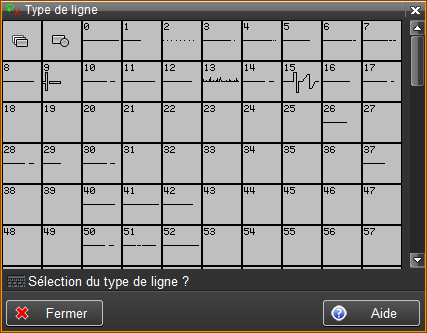 Lorsque la fonction est inactive la sélection des types de ligne n'est possible que pour les types de ligne 0 à 7 qui sont les types de ligne système et non modifiables. Si la fonction est active, les types de lignes de 0 à 253 sont affichés, et les types de lignes de 8 à 253 sont modifiables par l'utilisateur.
