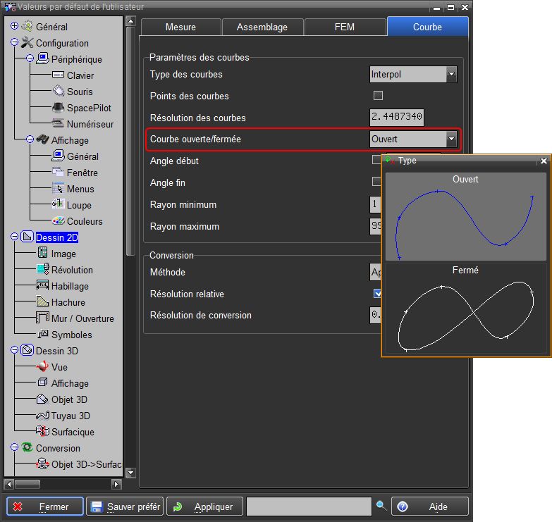 Permet de choisir le type Ouvert ou Fermé par défaut pour la création de nouvelles courbes . Cette fonction peut être modifiée dans les options de l'utilisateur.
