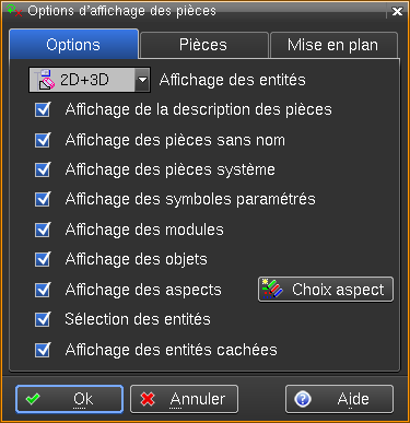 Pour des informations supplémentaires voir la fonction Options d'affichage des pièces.