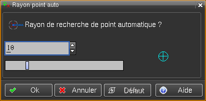 Permet de régler le rayon de recherche autour du curseur en mode Point auto On . La dimension choisie est visualisée par la dimension de la mire du curseur. Elle est adaptée en permanence au zoom choisi.