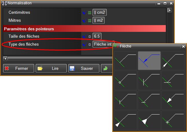 Permet de sélectionner le type de flèche par défaut pour la création d'un nouveau pointeur . Cette fonction peut être modifiée dans Modif normalisation .
