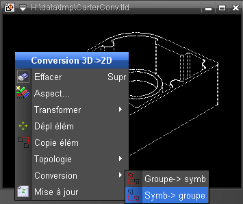 Les zones vue peuvent être converties en 2D avec les fonctions 3D -> 2D (prend seulement les entités 3D), et 3D+2D -> 2D (avec les entités d'habillage). Ces fonctions sont accessibles depuis le menu contextuel.