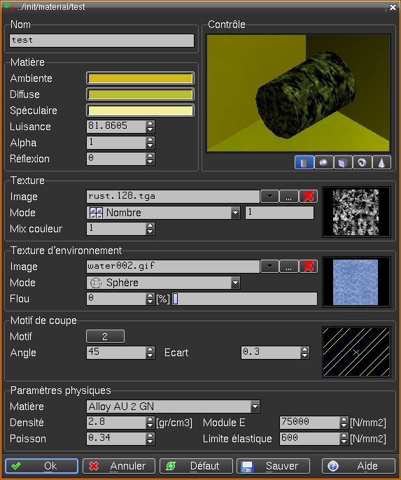 Paramètres Nom MODIF dans la rubrique « Nom » permet de lire une matière existante pour servir de base à la nouvelle matière. Matière Ambiante, diffuse, spéculaire.