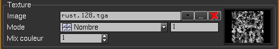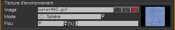 •Nombre/Dimension : En mode « Nombre », la texture rempli la face donnée une ou plusieurs fois selon la valeur donnée (si la proportion X/Y est différente de 1, la texture est déformée). En mode « Dimension », la texture a la taille donnée selon les unités courantes. •Mix couleur : Coefficient de mélange de la couleur de la matière avec la texture. Il est possible d’associer une texture d'environnement à une matière et éventuellement de modifier le flou de l'image de la texture pour rendre l'aspect de la matière plus brillante ou mat.